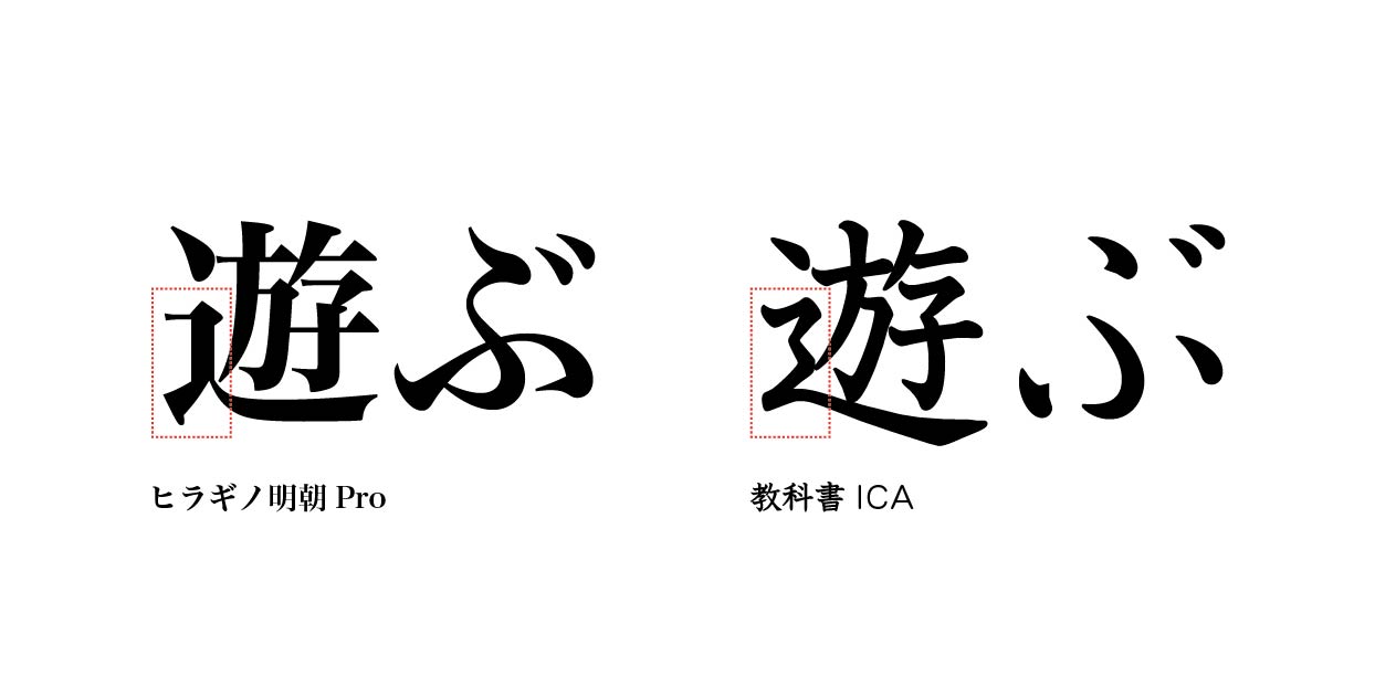 左の「ヒラギノ明朝」と右の「教科書ICA」では同じ明朝体でも「しんにょう」の形が異なります。