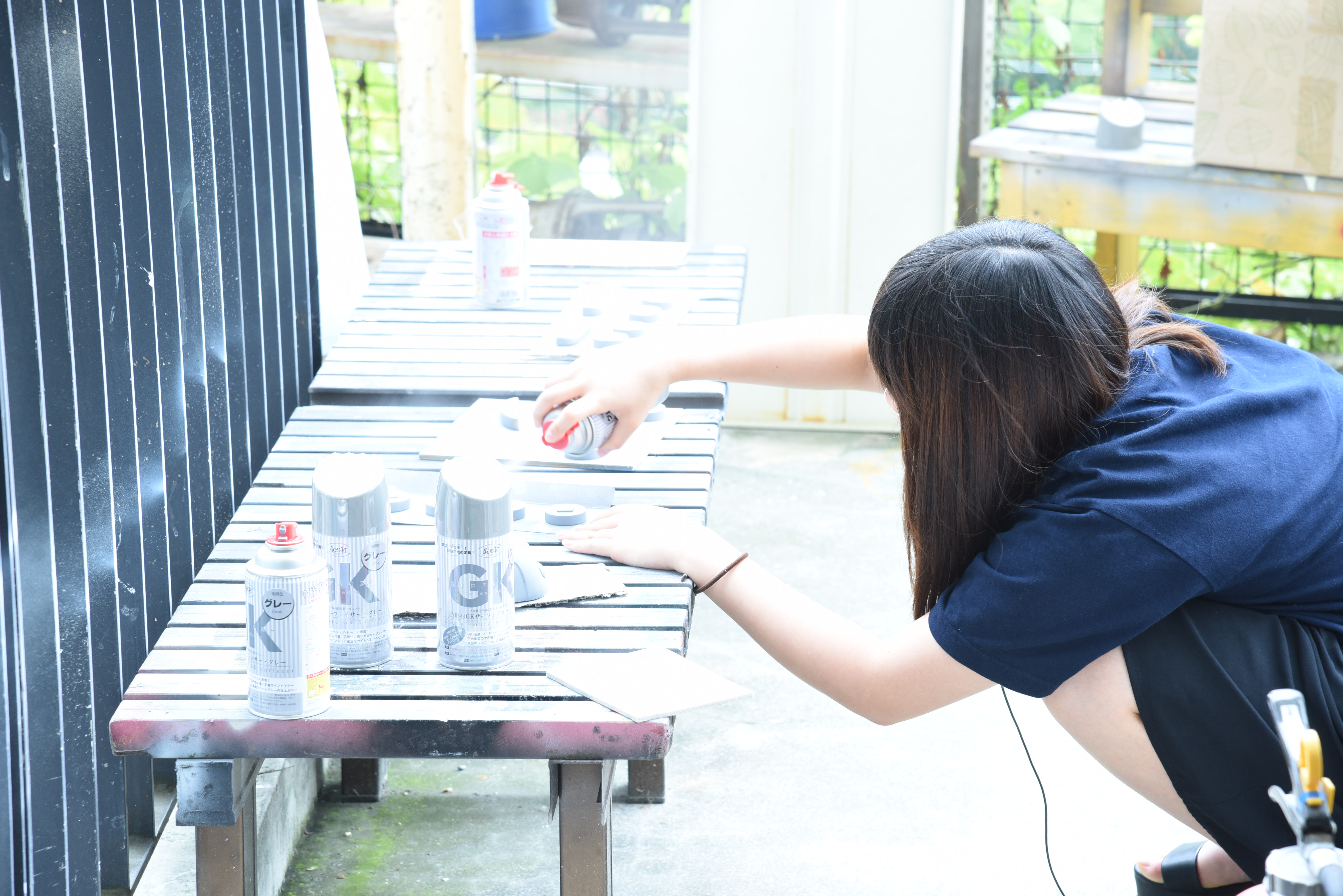 アクリルガッシュで筆塗をするところや、スプレーでの塗装も行います。天気があまり良くなかったので、乾燥に時間がかかってしまいました。