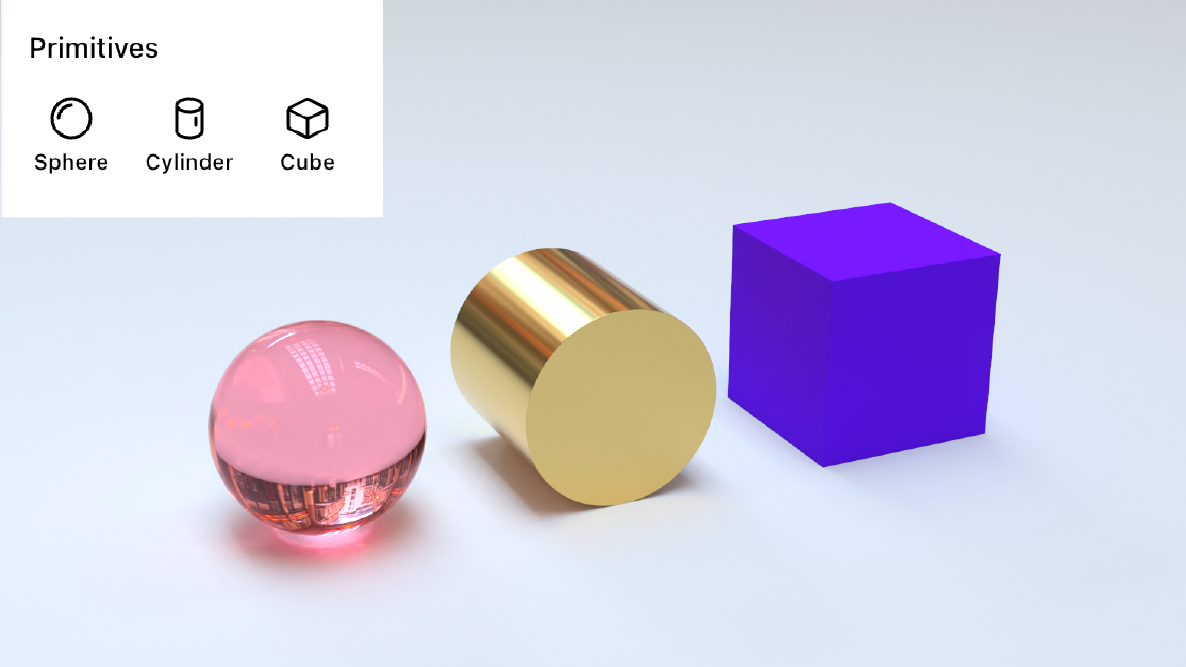 メニューバーのObjects > Primitives > Sphere, Cylinder, Cube から好きなかたちを選択します。 ②自由に動かす