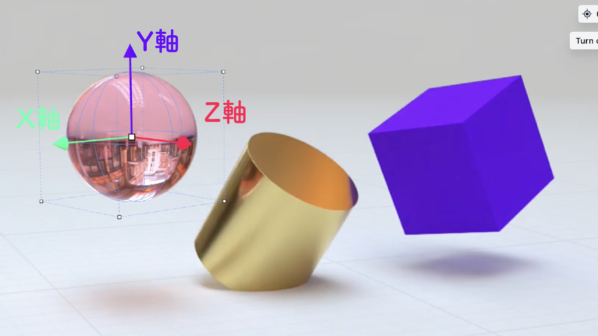 オブジェクトをクリックすると、3方向の矢印(X軸・Y軸・Z軸)が現れるので、好きな方向や角度に動かします。 ③形成