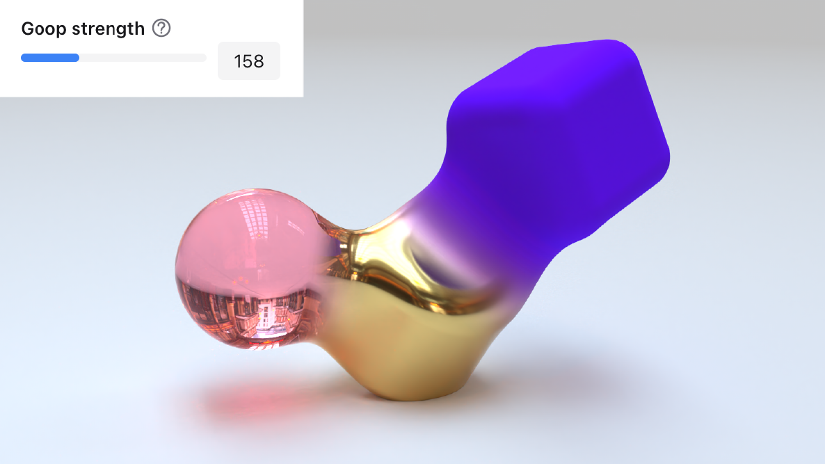 「Womp 3D」最大の特徴として、かたち同士を自由にくっつけることができます。 強度は自由に調整できるので、とろけるような質感やグラデーションなどを簡単に表現することが可能です。 右ウインドウのObjects > Goop strength でかたち同士の粘着どあいを調整します。 以上が基本操作の流れになります。 今回ご紹介した「Womp 3D」はいかがだったでしょうか。 他の3Dツールにはない自由な操作で簡単に制作できるので、 ひとまず3Dツールに触れてみたい人や、3D作品を増やしたい人などにおすすめです! このツールで3Dモデルに興味を持っていただき、 上級ツール(Blender、Fusion360)に挑戦していただくきっかけになれば幸いです。