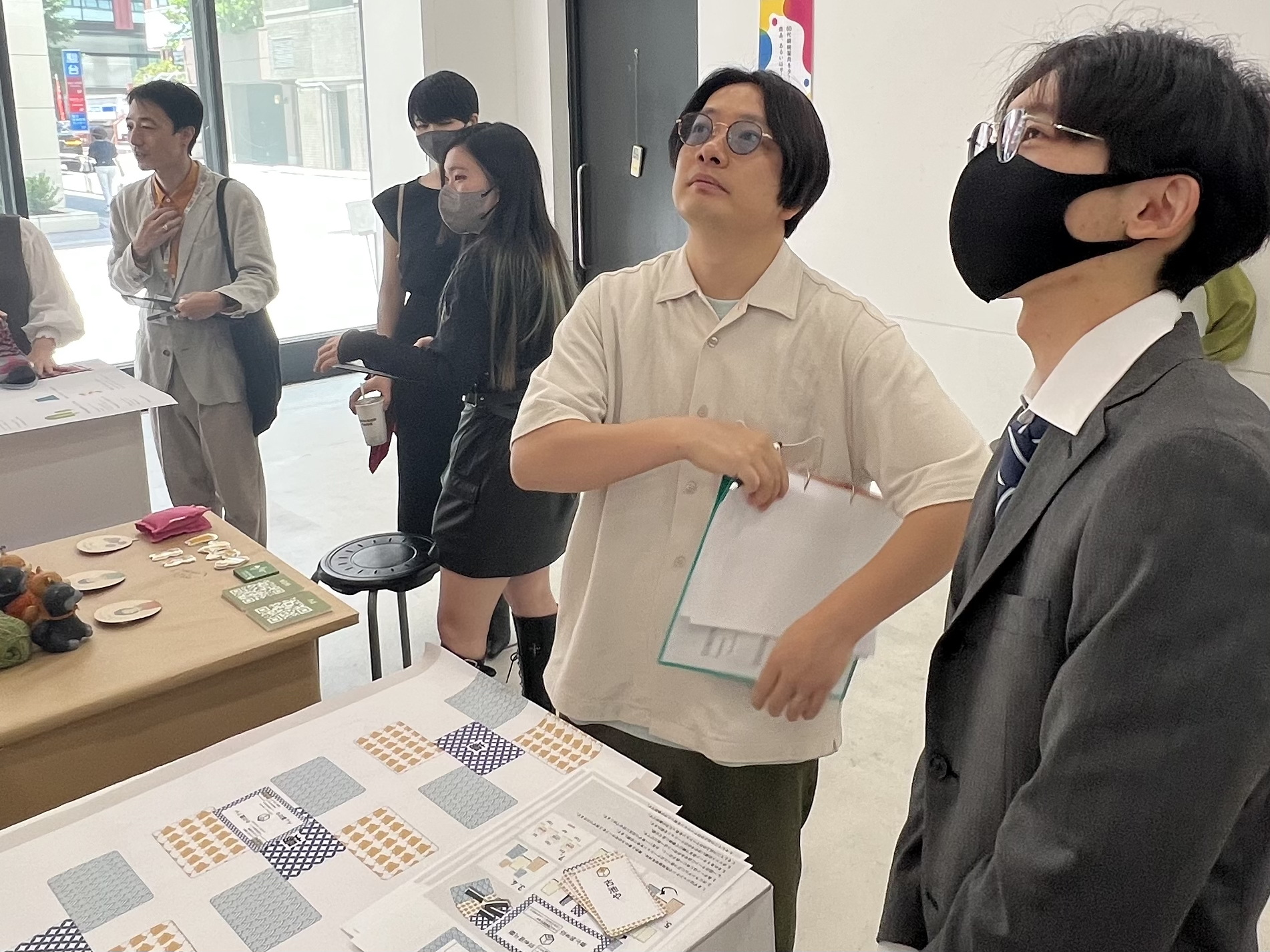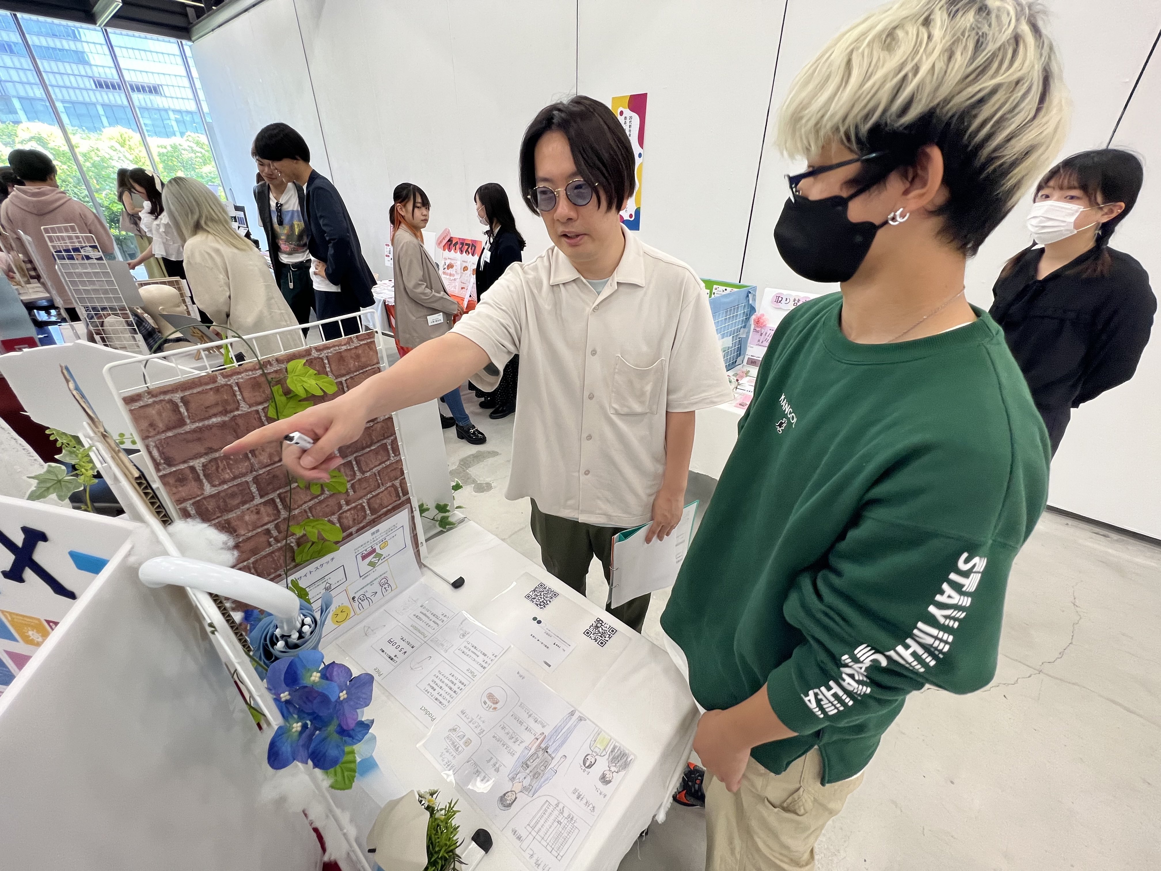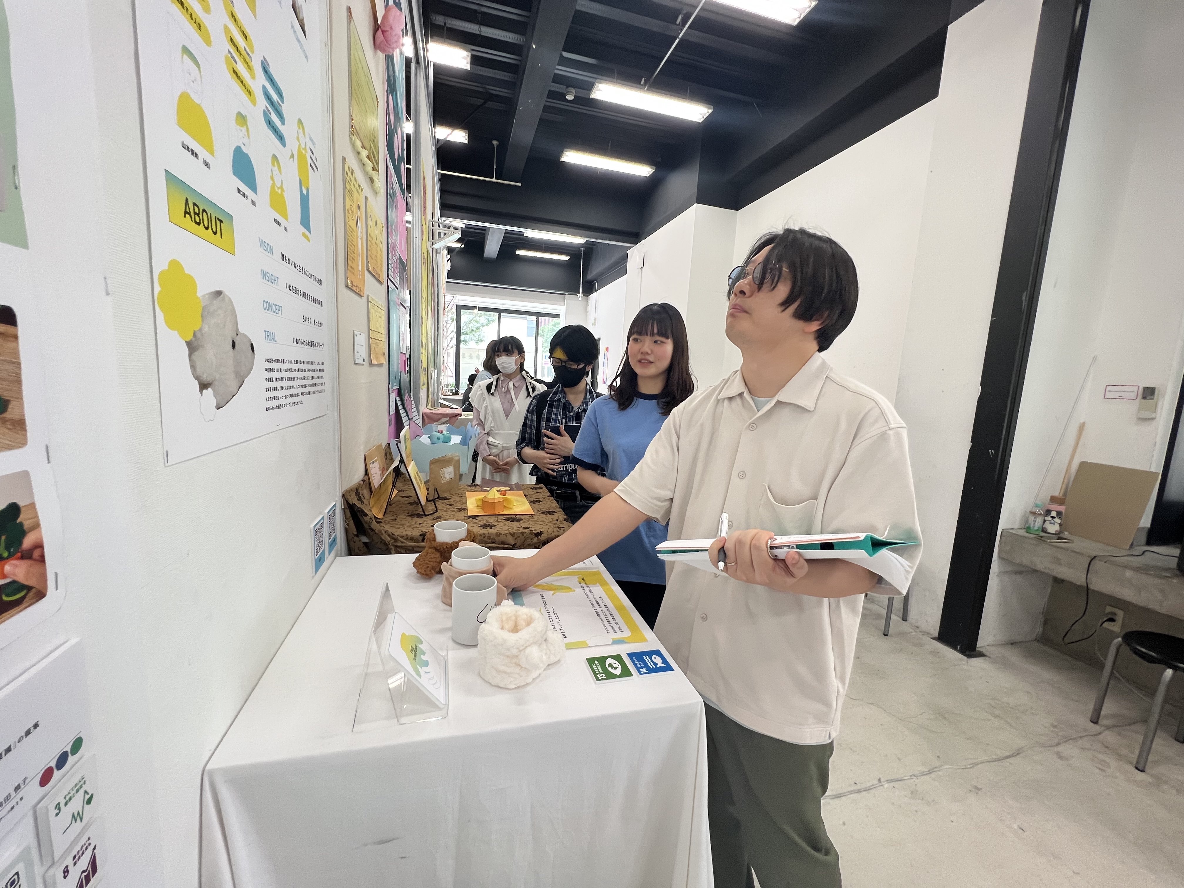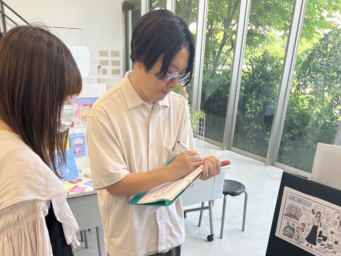 生徒一人一人に気さくに挨拶し実際に商品を体験しつつ展示の全体を見てどんな企画なのかパッと理解し、次々と審査をしていきます。