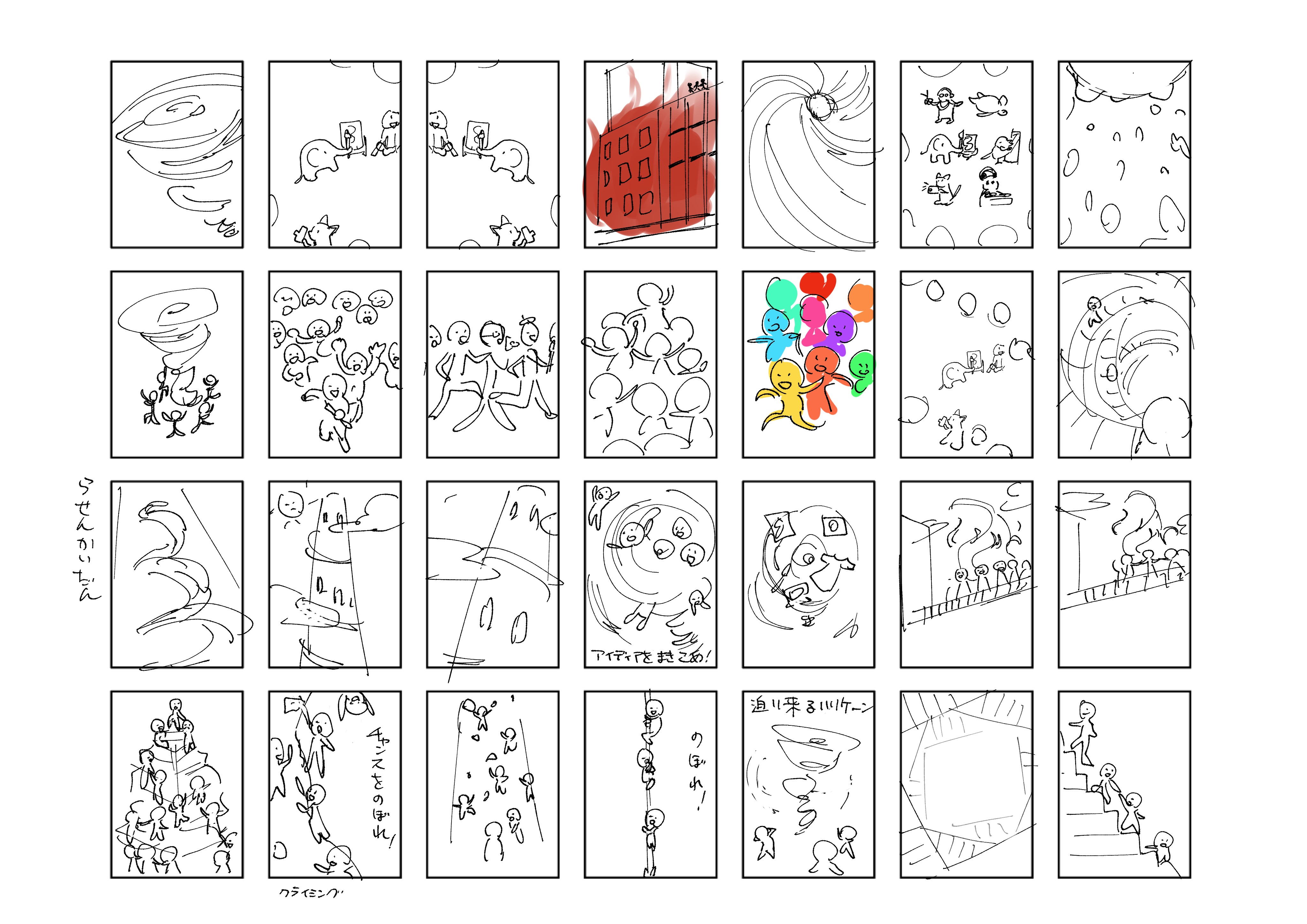 これを元にみんなでラフをたくさん出します。渦を巻いている案もいくつかありますね!
