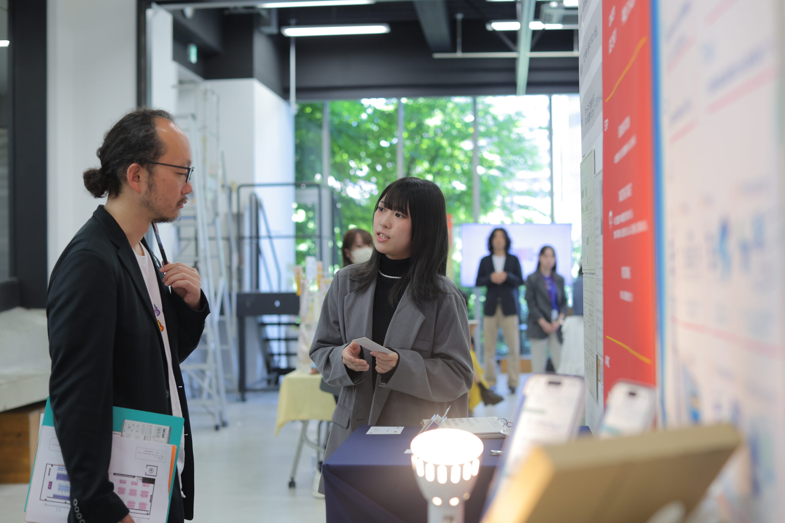 企画の説明を読んだり、トライアルを実際に手に取ったりしながら学生のプレゼンに耳を傾ける阿部さん。