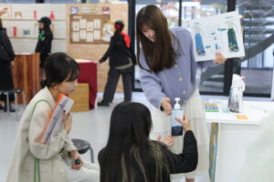 4階の1年生の展示では、学生から授業で街頭インタビューを行ったことを聞いた下山さん。