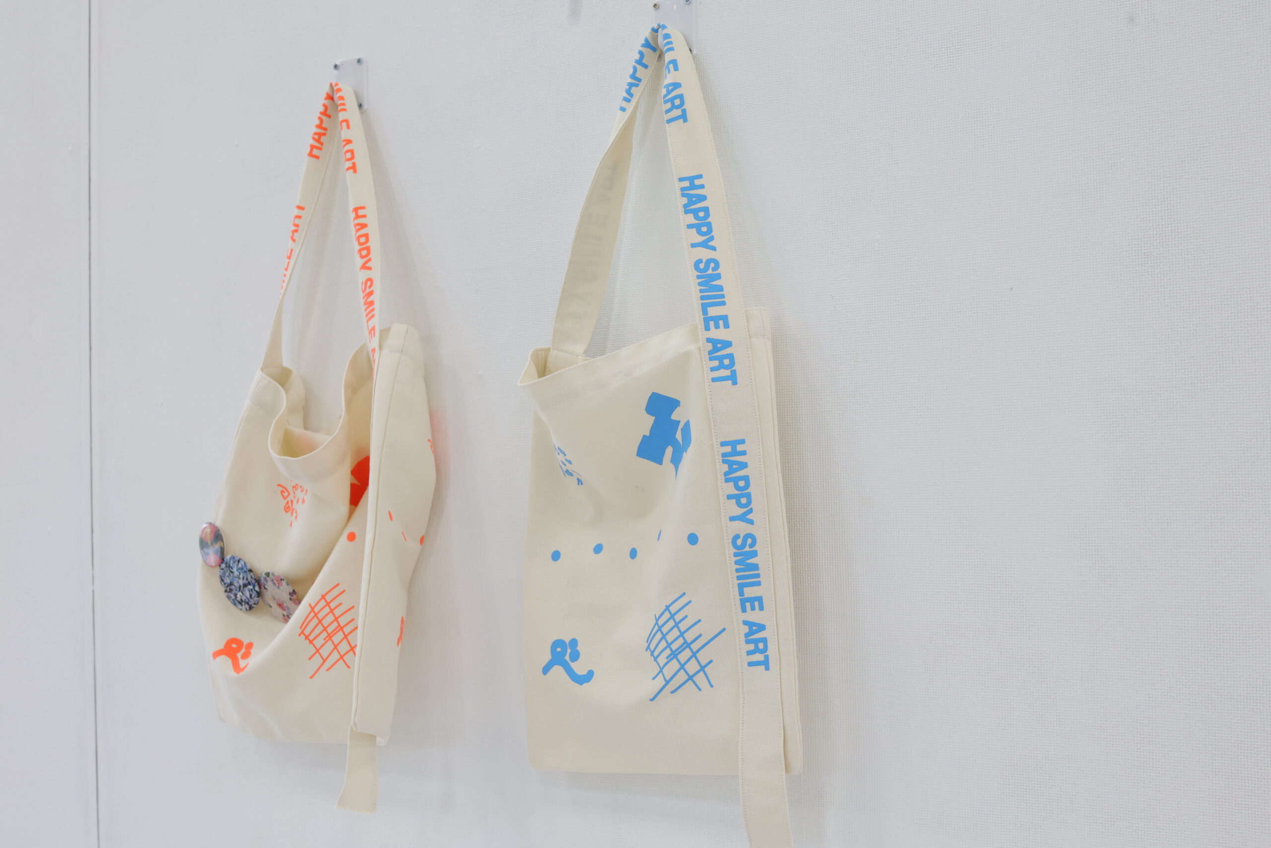 私たちの提案するJoypは、ハッピースマイルアート展のオリジナルトートバッグを持ちながら