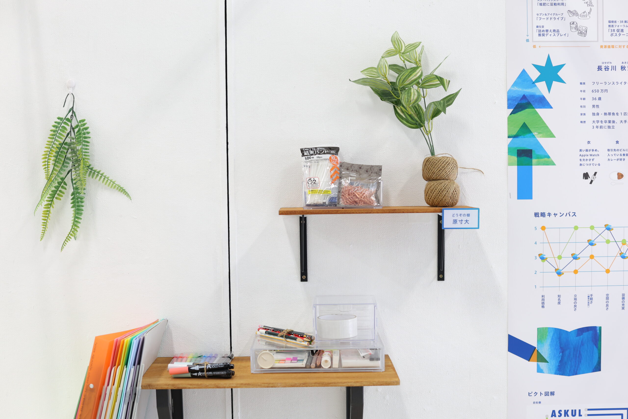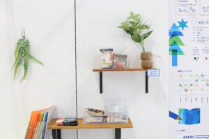 【企画概要】 資源循環を感じられるシェアオフィス事業の提案。個人事業主などの個人あるいは少人数体制の企業を ターゲットとし、不要になったオフィス用品を譲り合えるサービス「どうぞの棚」を設置・運用する。
